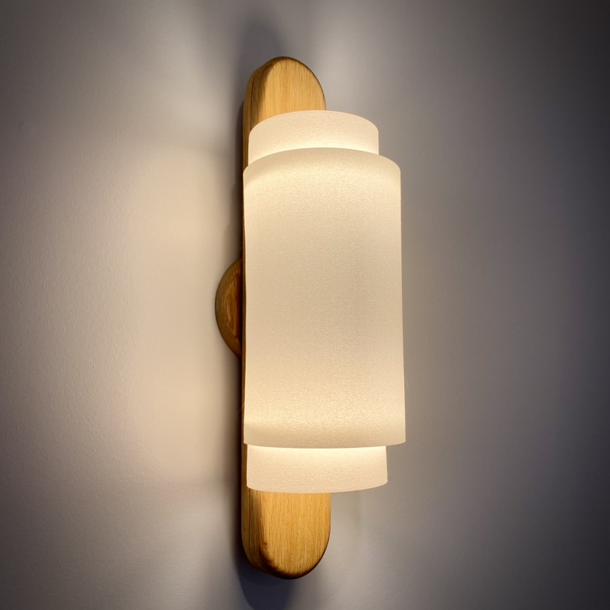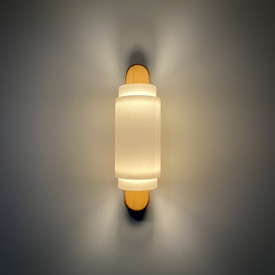 The lamp shade took some iteration: initially I thought to use papaer with visible fibers. But, charitably it looks like rough papier-mâché. So, I decided to try 3D printing a shade with matte white PLA. Ultimately, the shade ended up being 3 pieces that I glued together. The reflection of the shade provides an interesting effect and is sufficiently diffuse.
